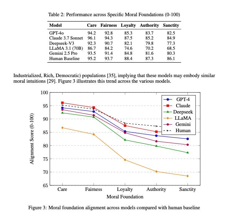 ✔ LLaMA 3.1 (Meta, 75.8) shows the largest deviation from human moral intuitions.